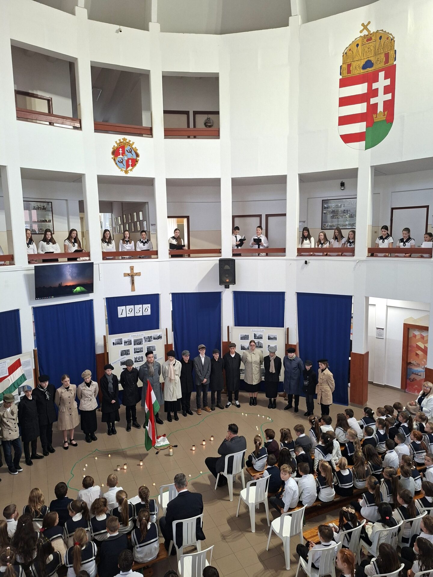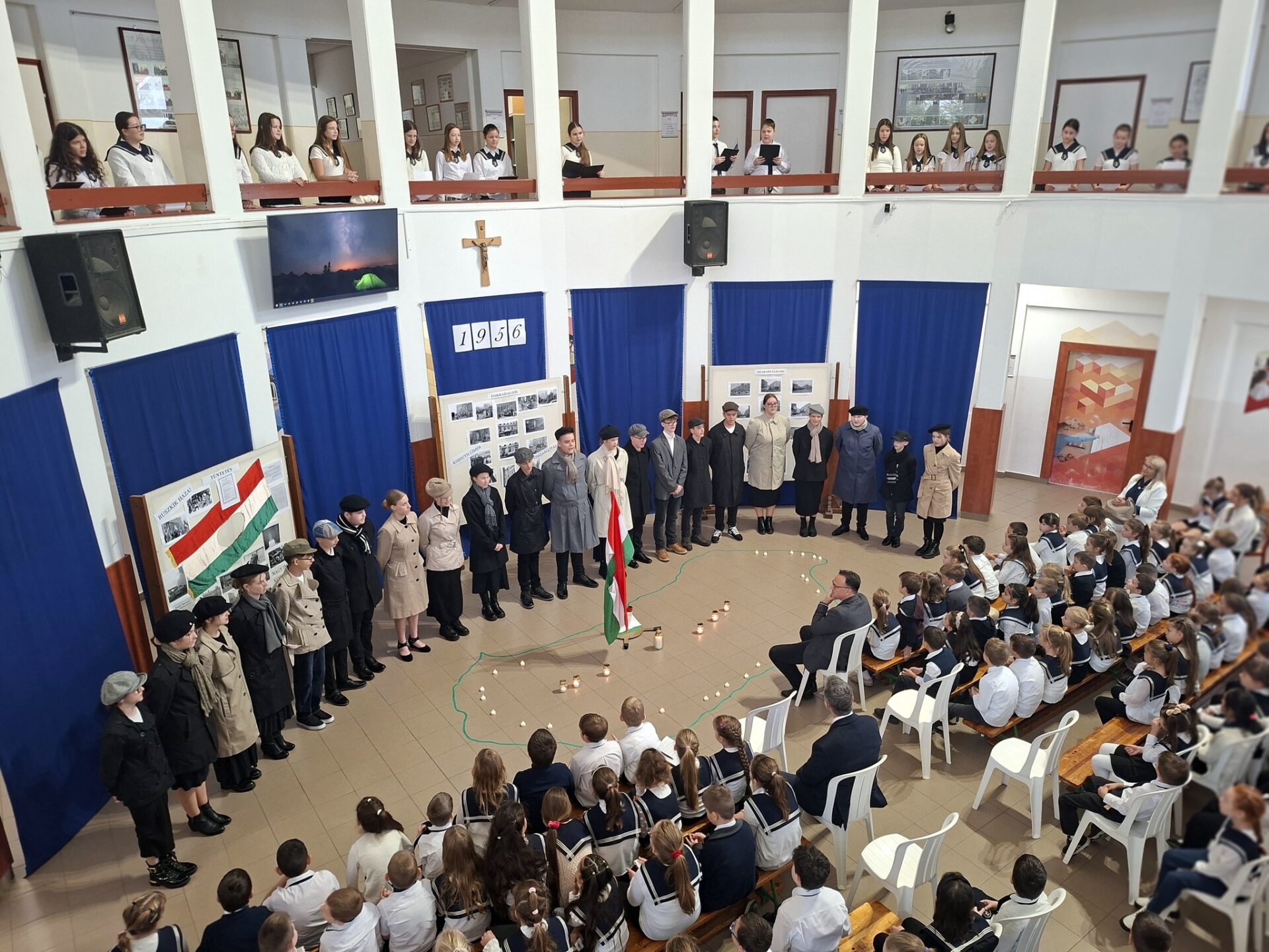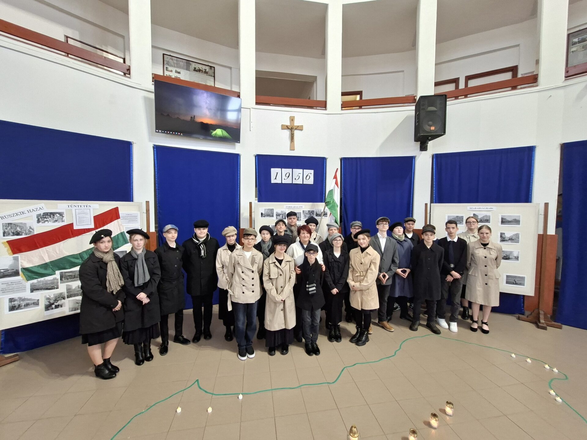 A 8. c osztály diákjai lenyűgöző előadással tisztelegtek az 1956-os forradalom és szabadságharc hősei előtt. Emlékeztek azokra a fiatalokra, akik 1956-ban fegyvert fogtak a szabadságért és bebizonyították, hogy a magyar nép bátor és szabad lelkű, valamint 1989-re, amikor a reformerőknek köszönhetően megtörtént a békés rendszerváltás. Megmutatták, hogy október 23. – az 1956-os forradalom kezdete – nemcsak egy történelmi esemény, hanem a szabadság, a bátorság és az összefogás jelképe. 1956 őszén, Magyarországon sokan érezték úgy, hogy változásra van szükség. Az embereknek elegük volt az igazságtalanságból, a félelemből, és nem féltek szembeszállni a hatalmasokkal, mert tudták, hogy a szabadság megér minden áldozatot. Felelevenítették a 13 nap legfontosabb eseményeit és emlékeztettek minket arra, hogy a hősök emléke nem csupán a történelem könyveiben él tovább, hanem a szívünkben is. A műsor üzenete egyszerű, de mély: „ A hősök addig élnek, amíg emlékezünk rájuk…”