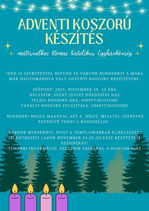 2025 november 29.-én, Advent első vasárnapja előtti szombatra, a családokat adventi koszorú készítésére hívjuk. Délután 13 órától, a Szent József közösségi házban, minden család megalkothatná a saját koszorúját, amit másnap reggel a miséken meg is áldana Heidelsperger István atya. Így minden család az otthonában vasárnapról vasárnapra egy megáldott, templomból hazavitt koszorún gyújthatná meg a gyertyákat a várakozás ideje alatt. Idén kétféle koszorú elkészítésére lenne lehetőség: a TELJES ennek az önköltsége 4000 Ft. Illetve TEREMTÉSVÉDELMI, ami a tavalyi koszorú felújítását jelenti, amelyhez csak zöldet és gyertyát biztosítunk, ennek a költsége 2000 Ft a többit a plébánia fizeti.