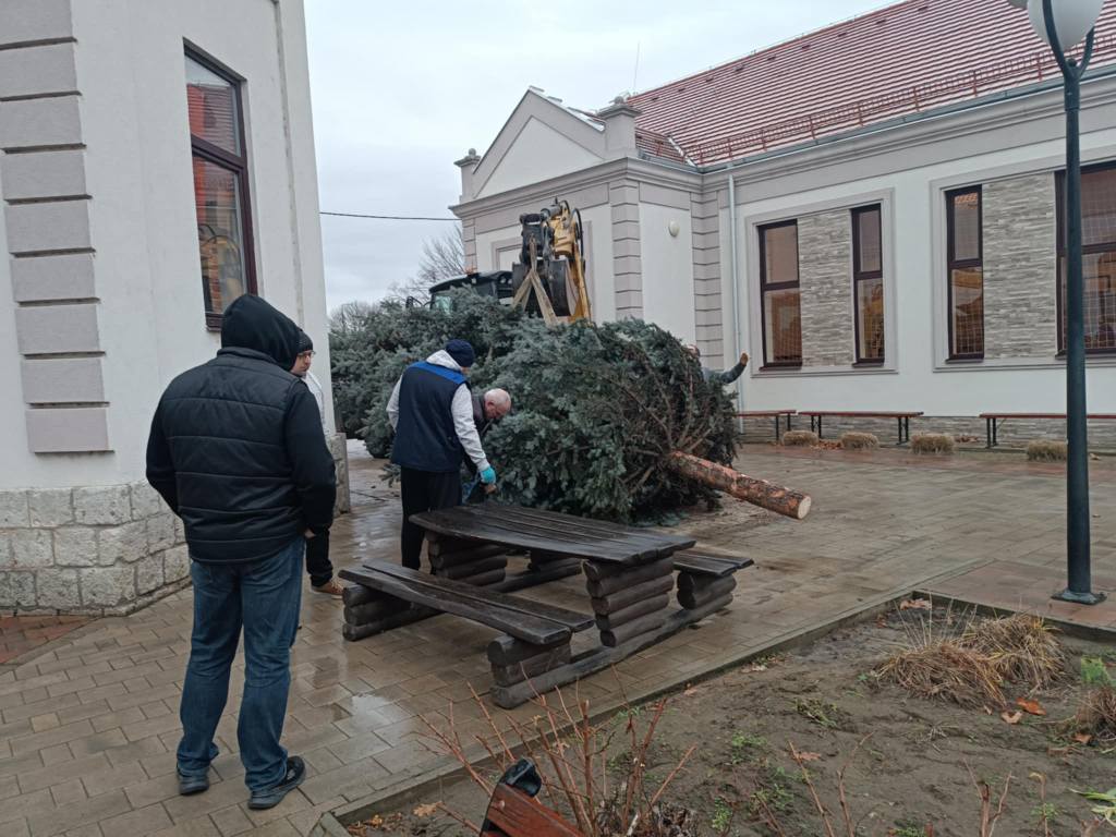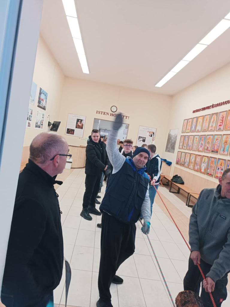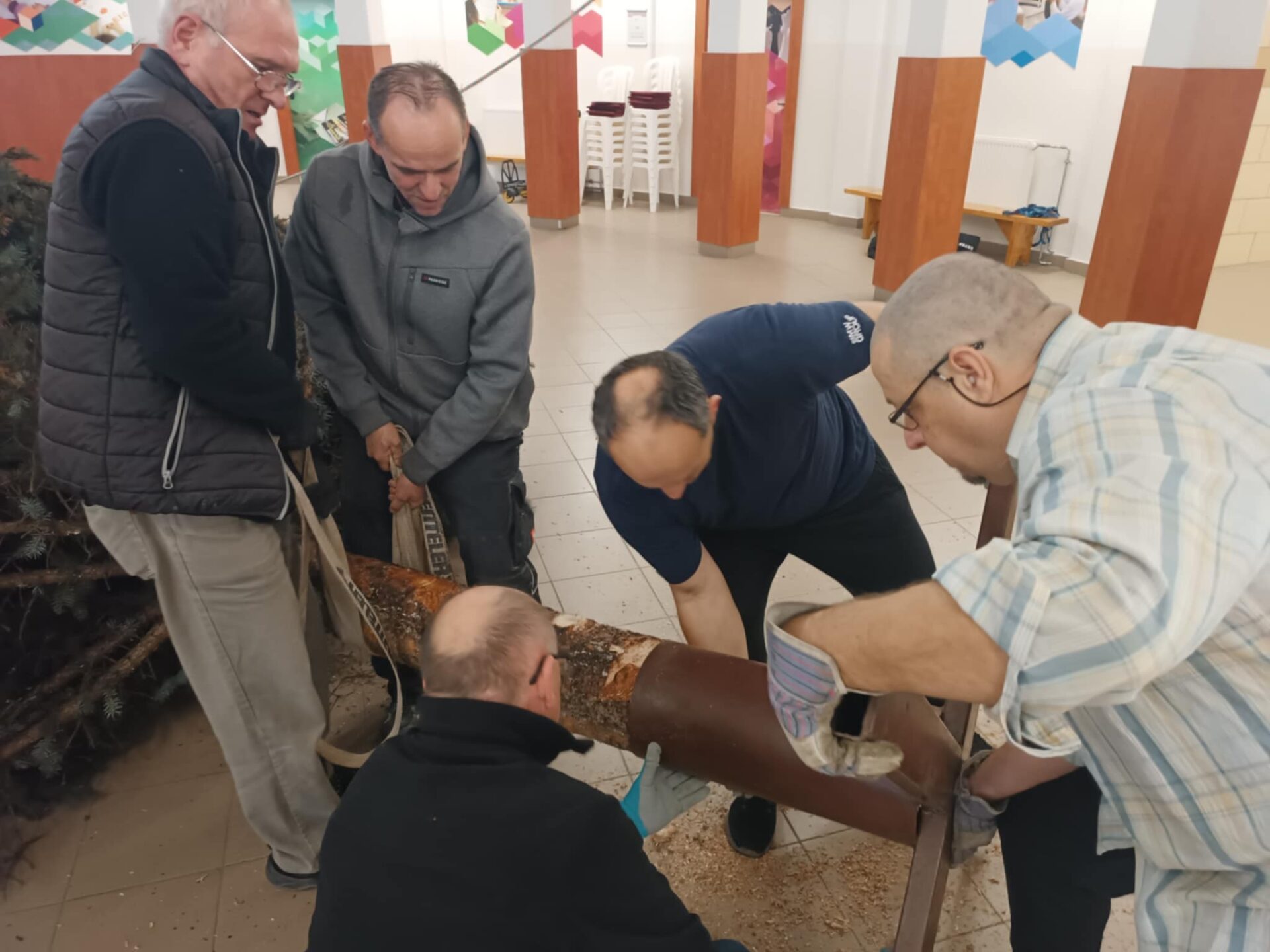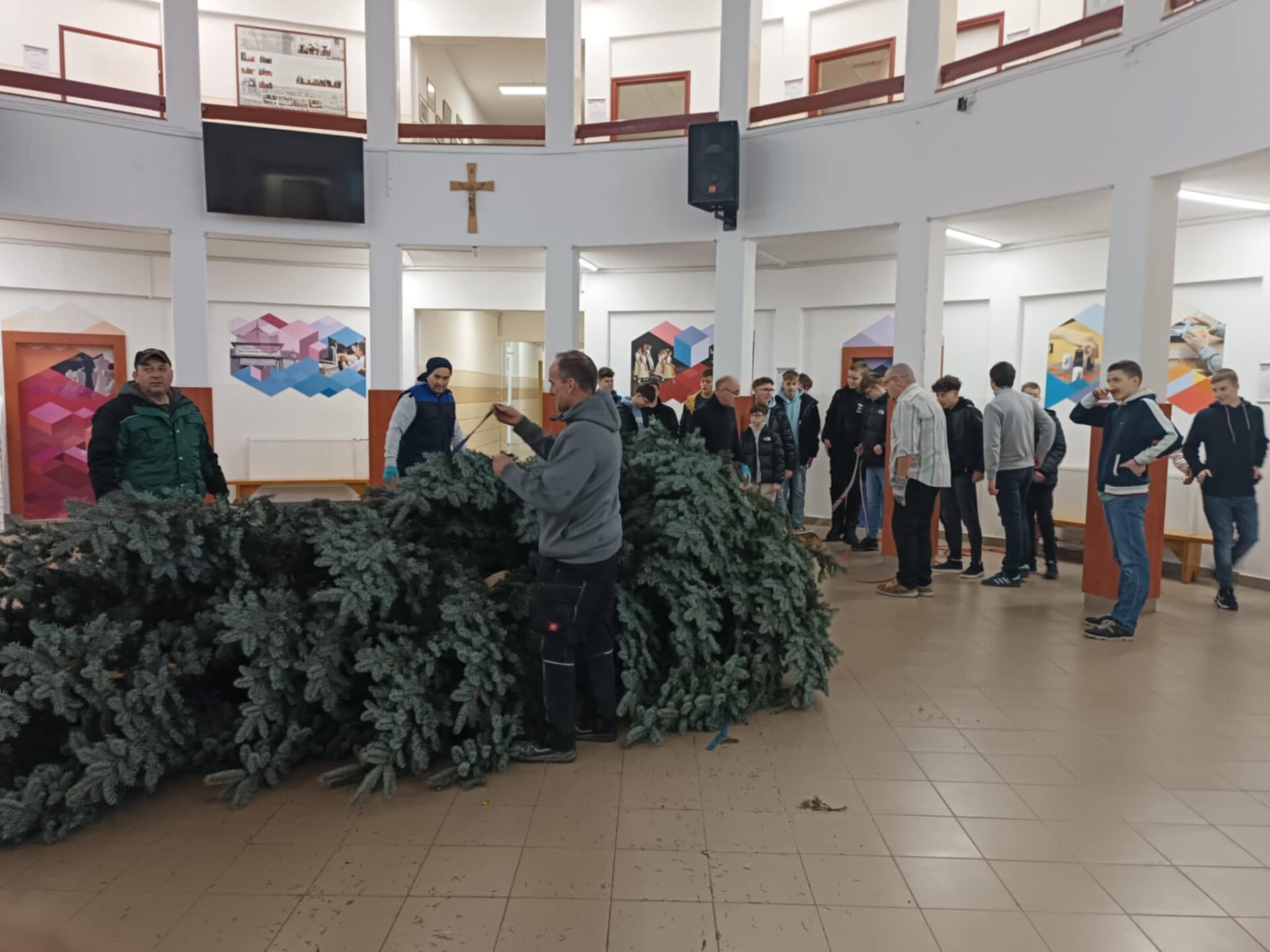 A fenyőfa kivágásában, szállításában és felállításában intézményünk karbantartói, pedagógusai és a 8. osztályos fiúk segítettek.