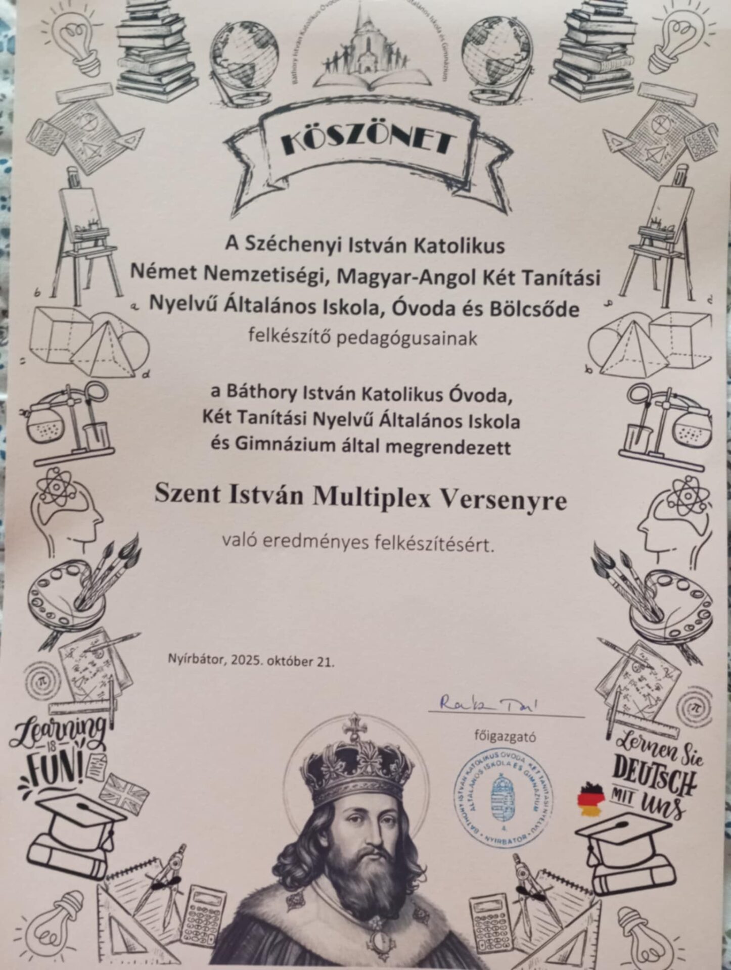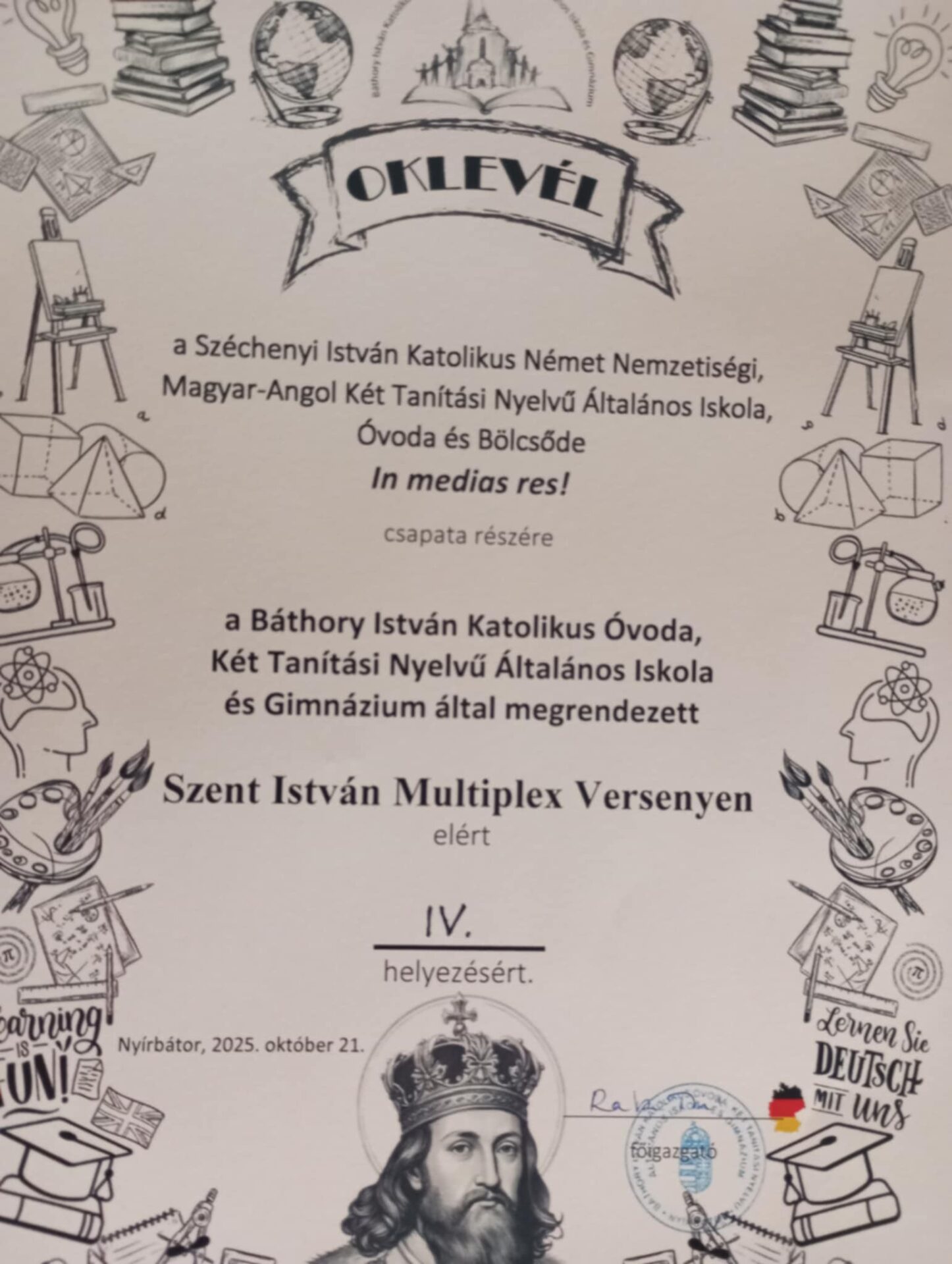 Az iskolánk 8. osztályos csapata október 21- én, a Báthory István Katolikus Óvoda, Két Tanítási Nyelvű Általános Iskola és Gimnázium által megrendezett Szent István Multiplex Versenyen IV. helyezést ért el.